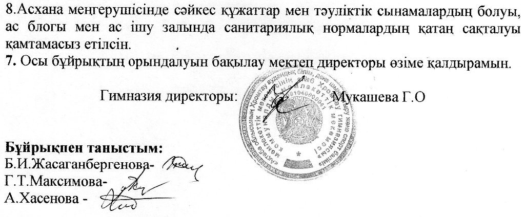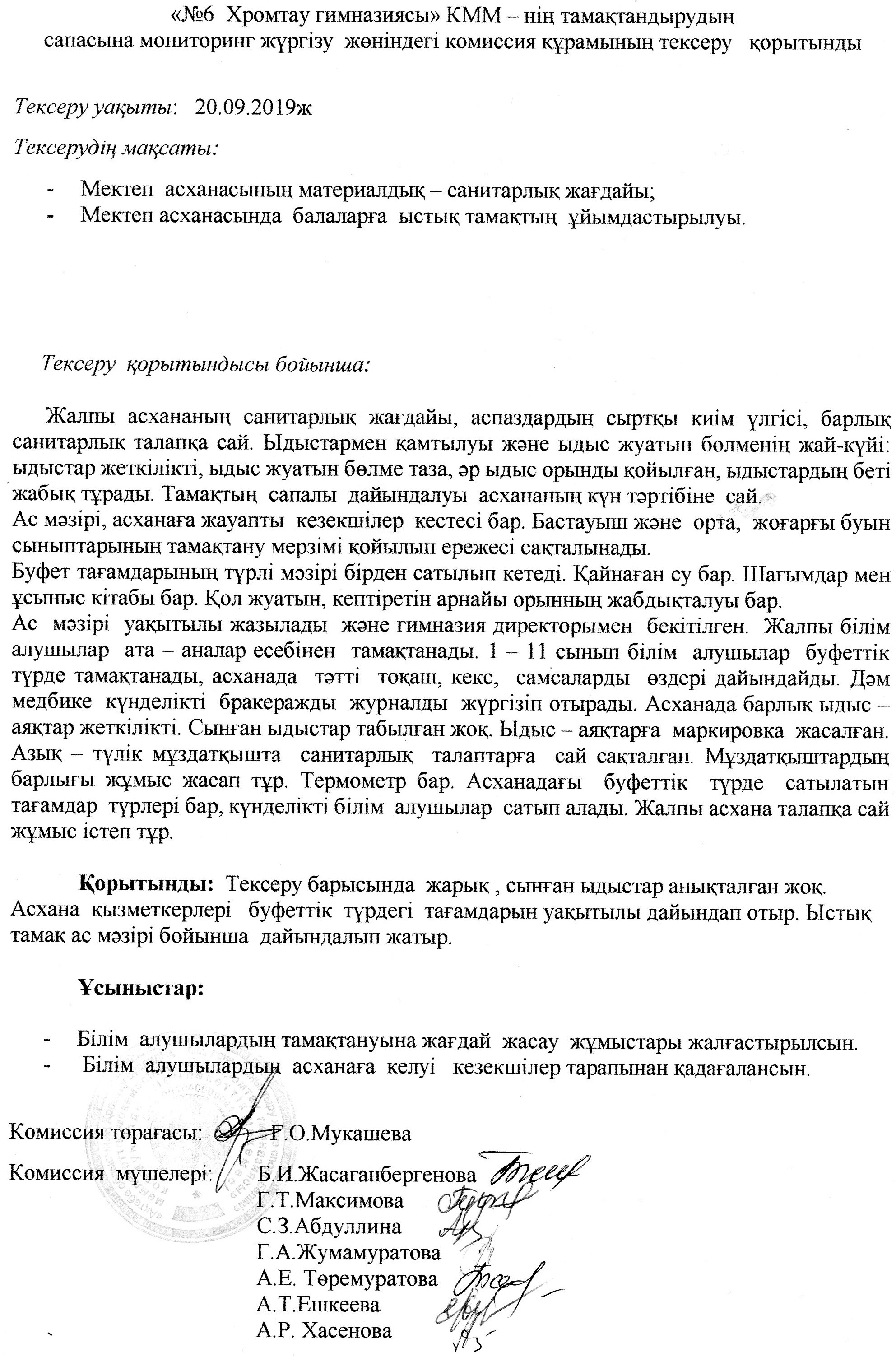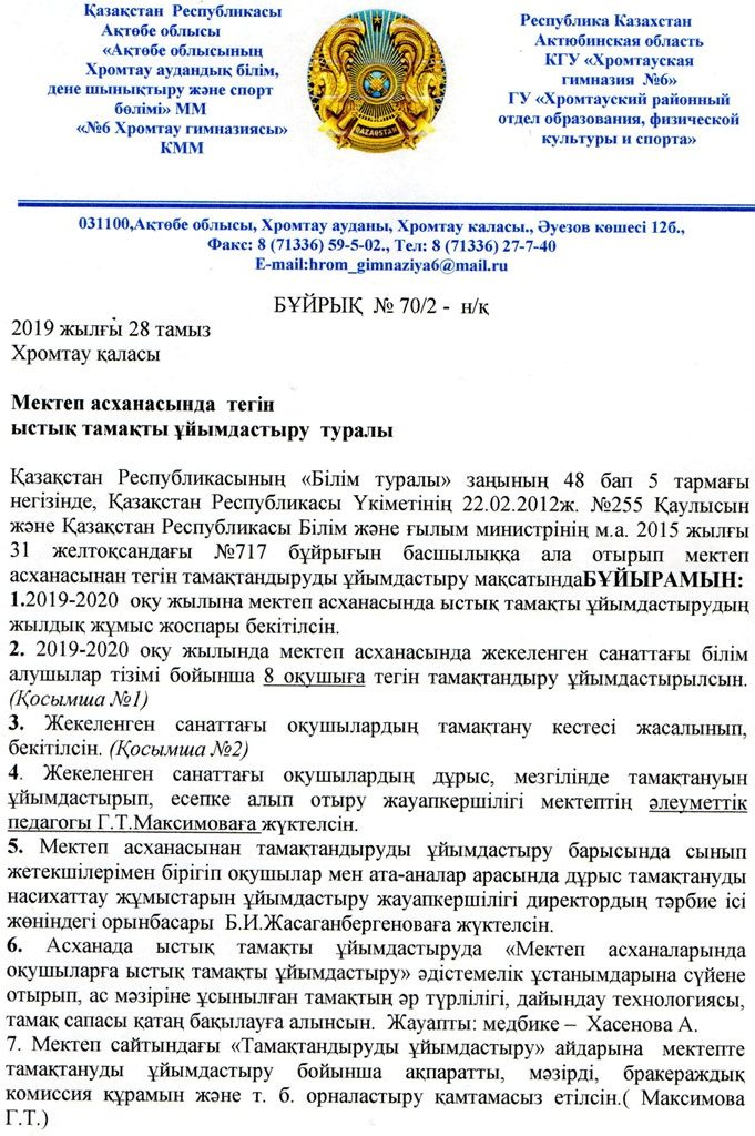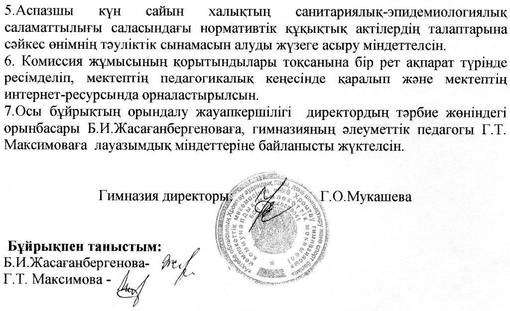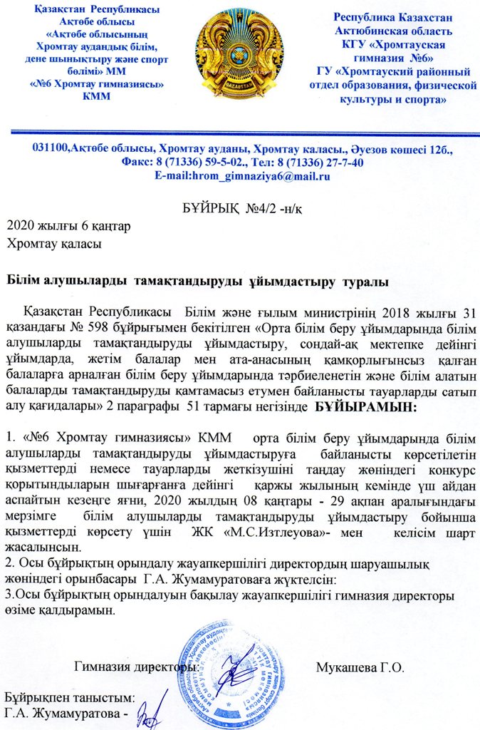 2. Осы бұйрықтың орындалуын бақылау №6 Хромтау гимназиясының бас есепшісі Урынбасарова Ж жүктелсін.