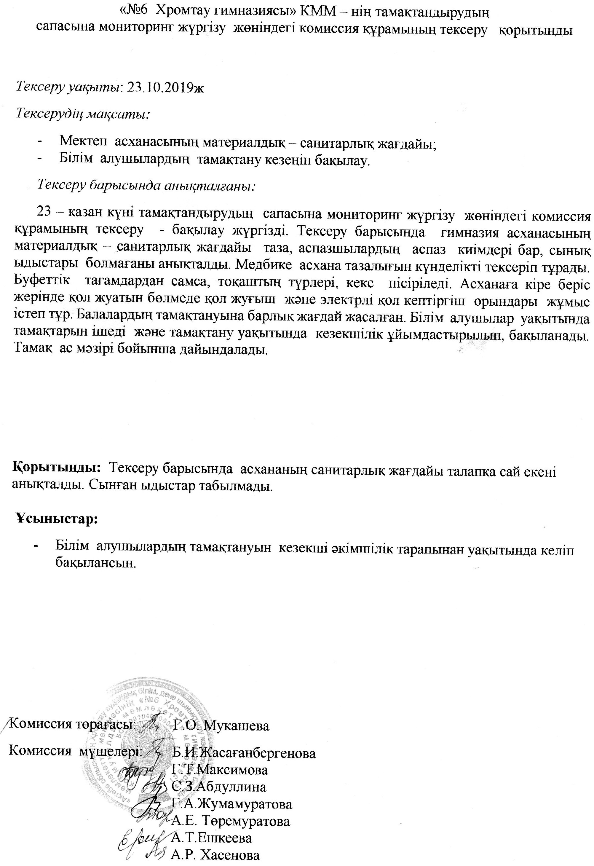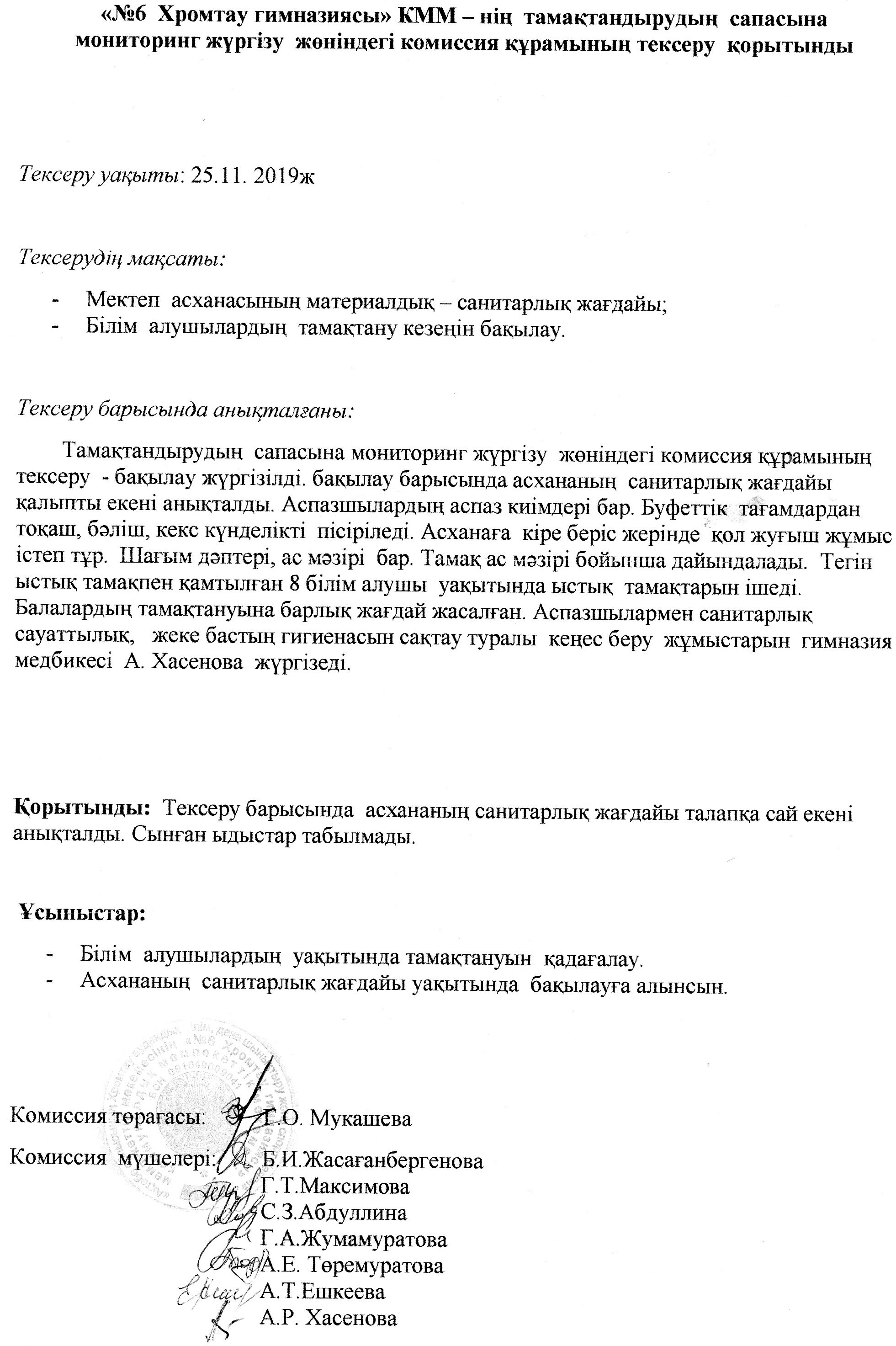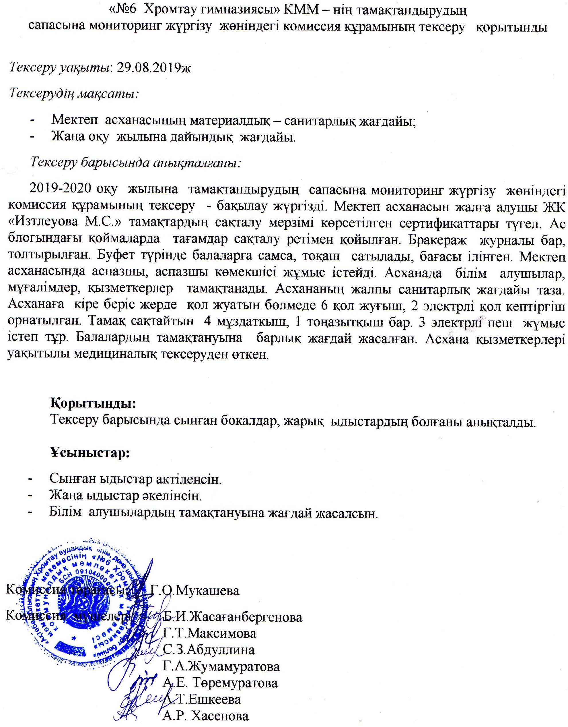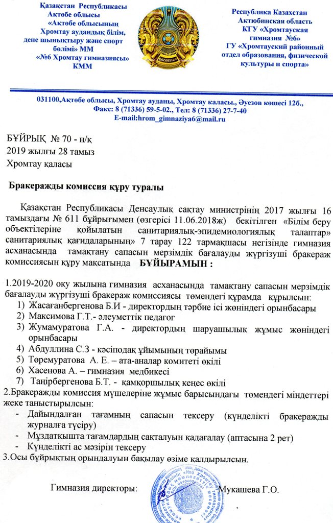 2. Осы бұйрықтың орындалуын бақылау №6 Хромтау гимназиясының бас есепшісі Урынбасарова Ж жүктелсін.