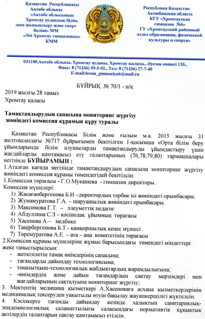2. Тауарларды және қызметтерді мемлекеттік сатып алудың жылдық жоспарын мемлекеттік сатып алулар www.goszakup.gov.kz порталында және №6 Хромтау гимназиясы ММ -нің www.gimnaziya6.kz сайтына жариялануын қамтамасыз етсін.