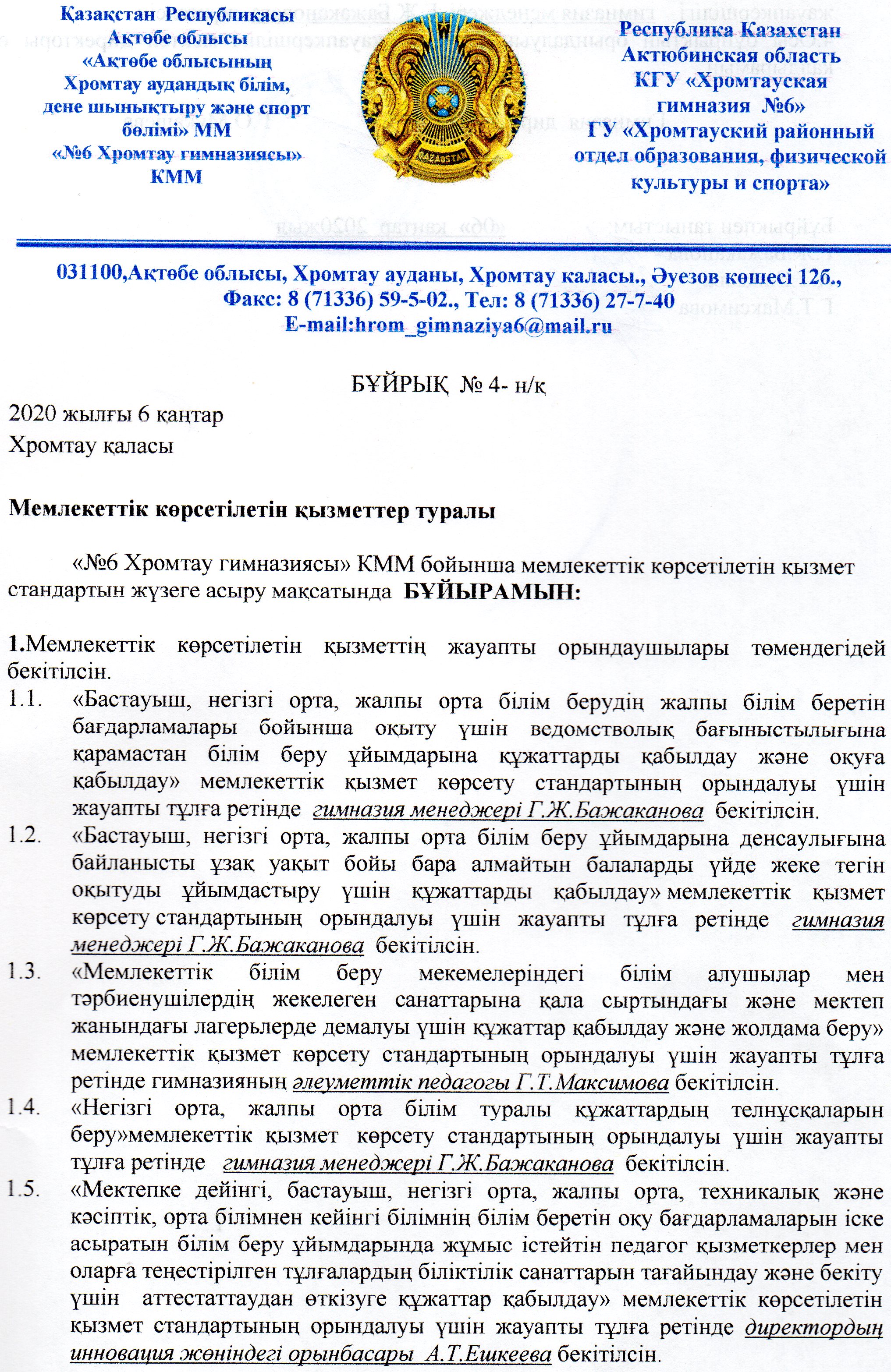 «№6 Хромтау гимназиясы» КММ мемлекеттік қызмет көрсету кестесі