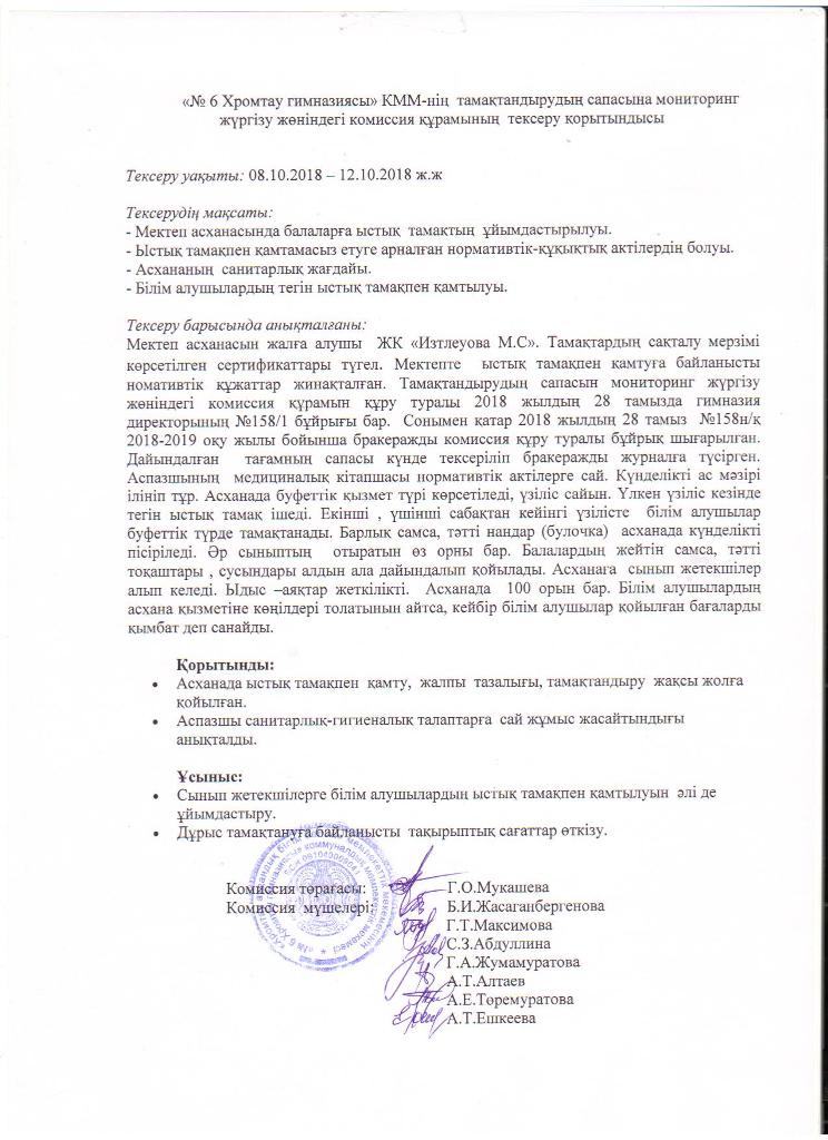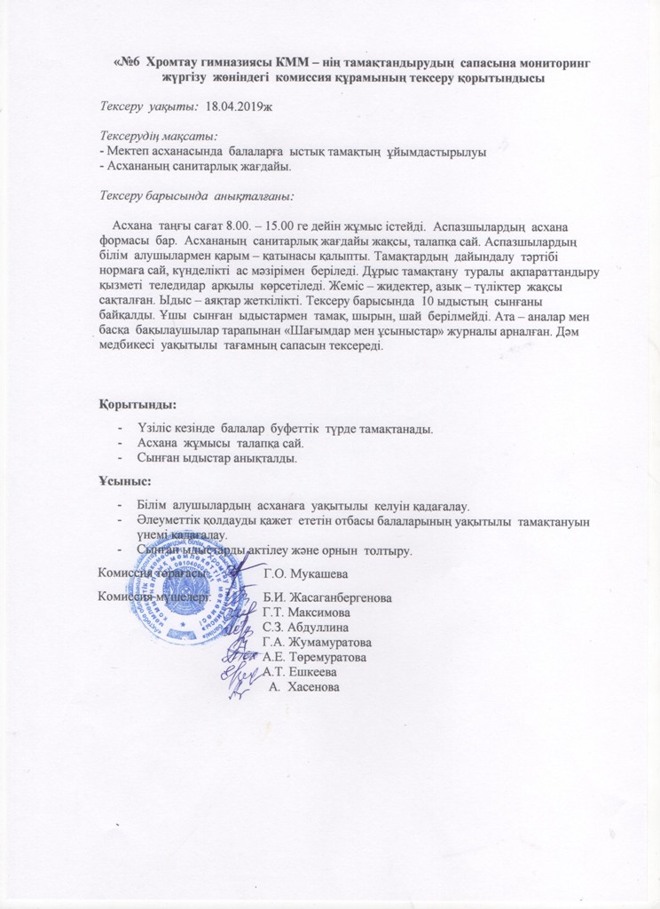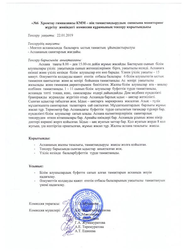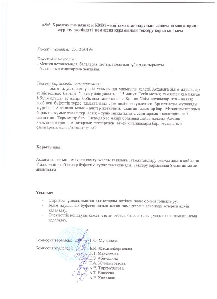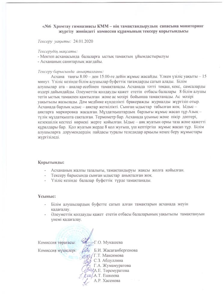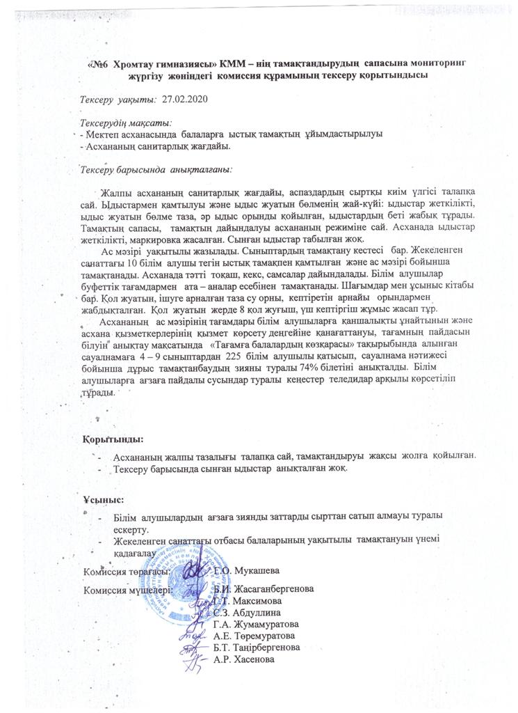 Тамақтандырудың сапасына мониторинг жүргізу жөніндегі комиссии құрамының тексеру қорытындысы