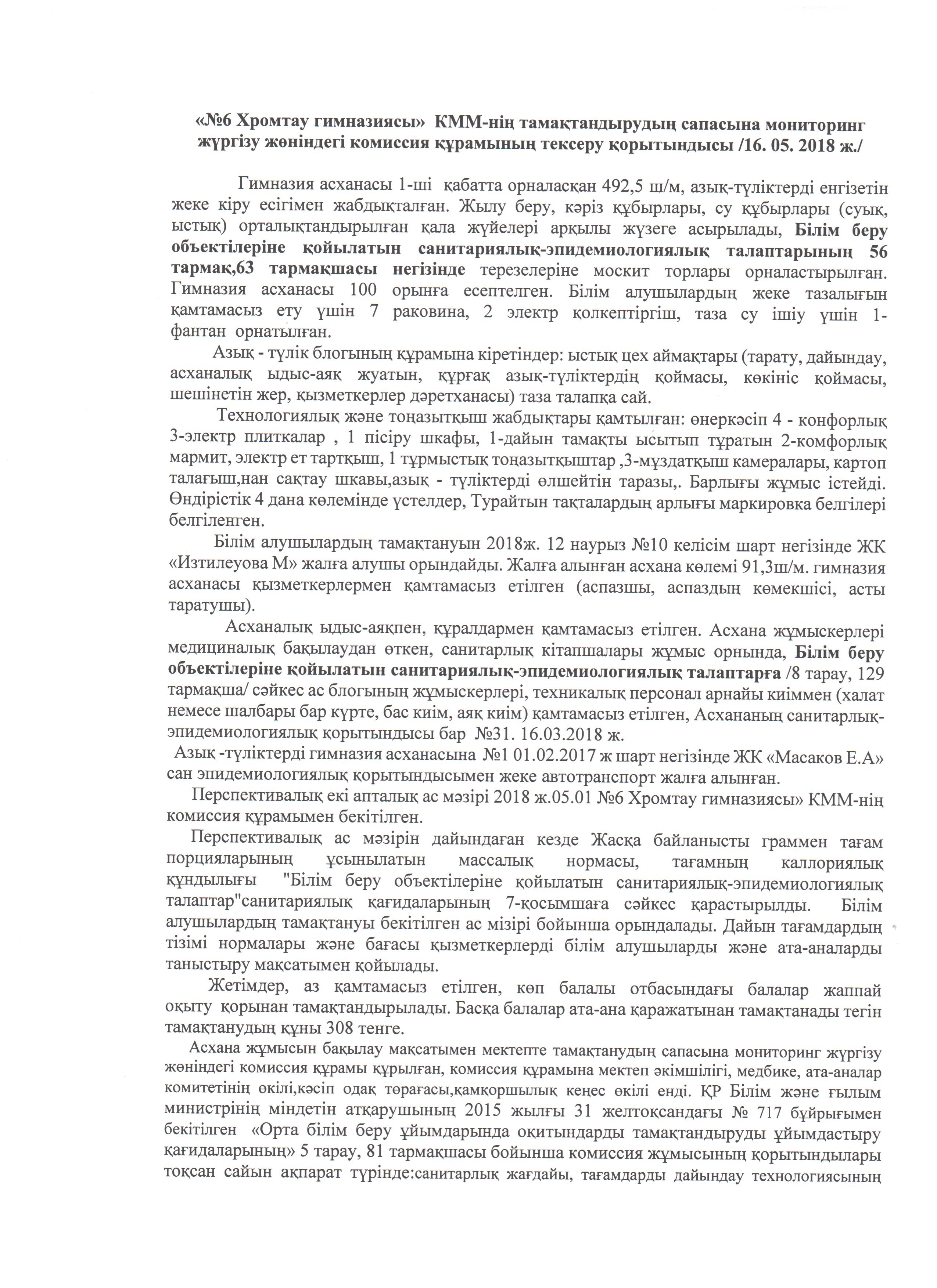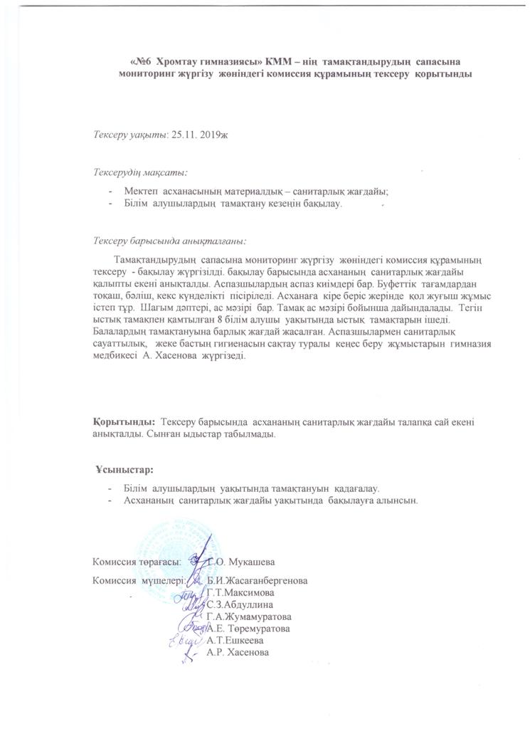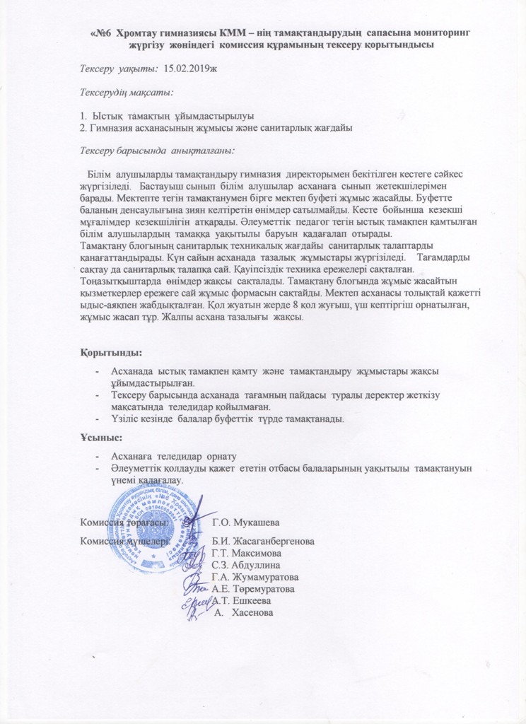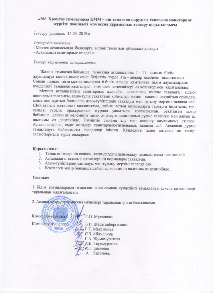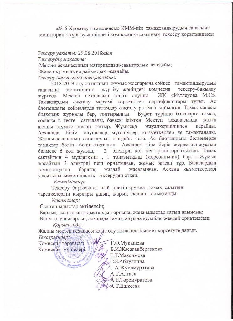 Тамақтандырудың сапасына мониторинг жүргізу жөніндегі комиссии құрамының тексеру қорытындысы