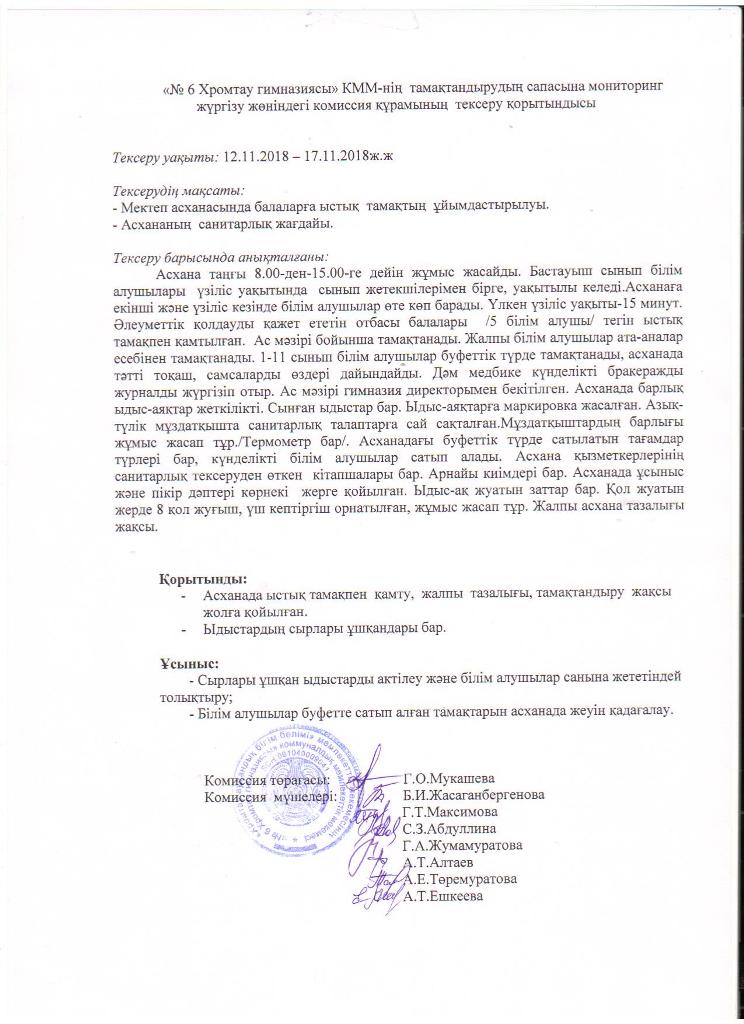 2019ж қараша тамақтанудың сапасына мониторинг жүргізу жөніндегі тексеру қорытындысы