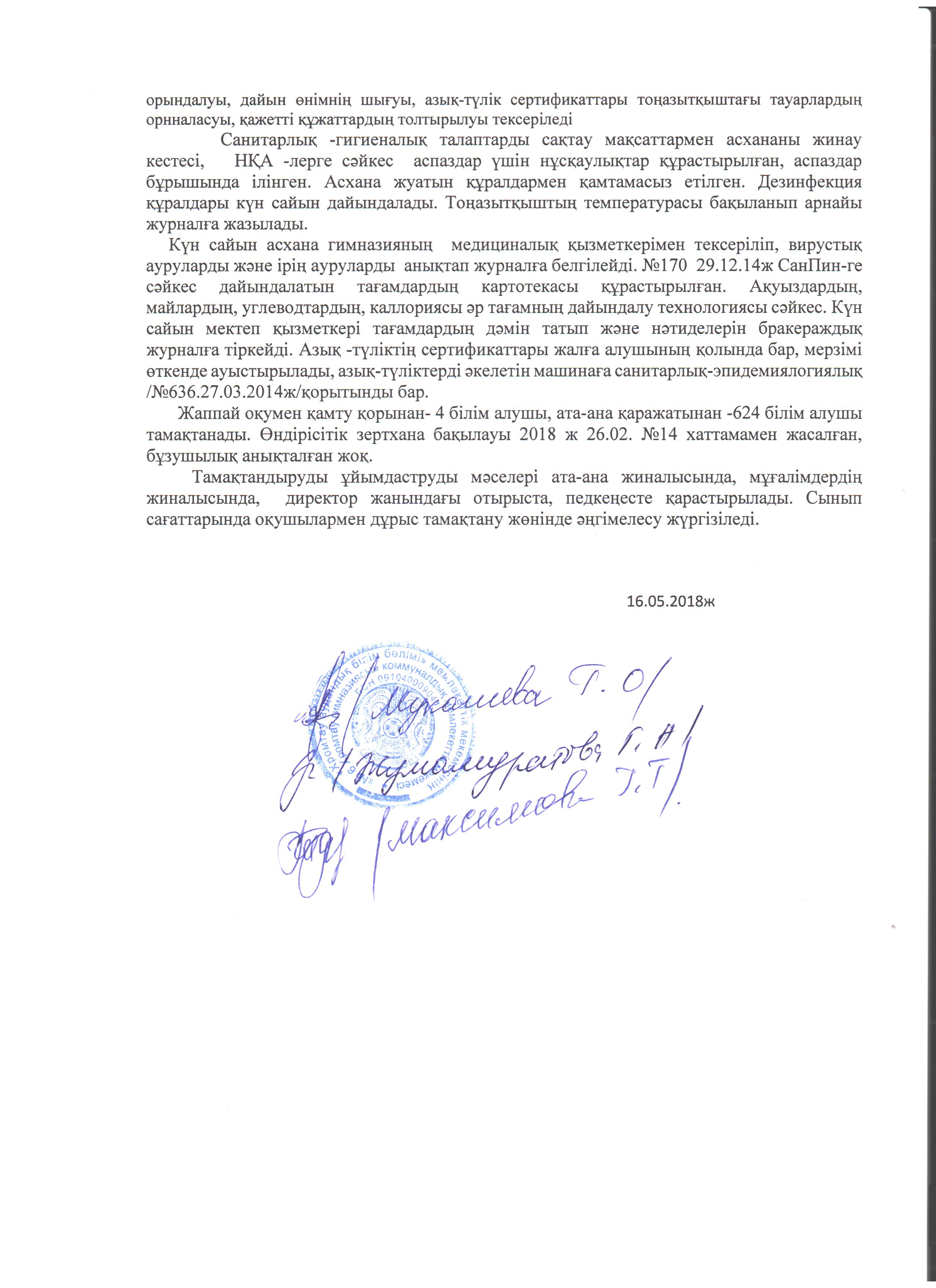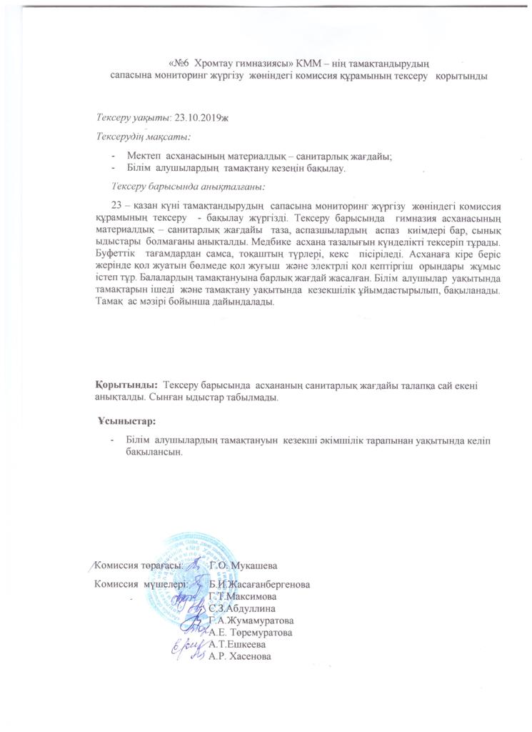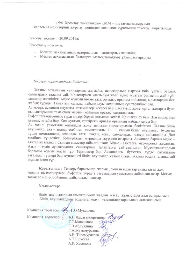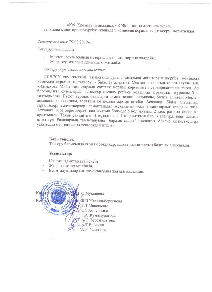 2019ж тамыз тамақтанудың сапасына мониторинг жүргізу жөніндегі тексеру қорытындысы
